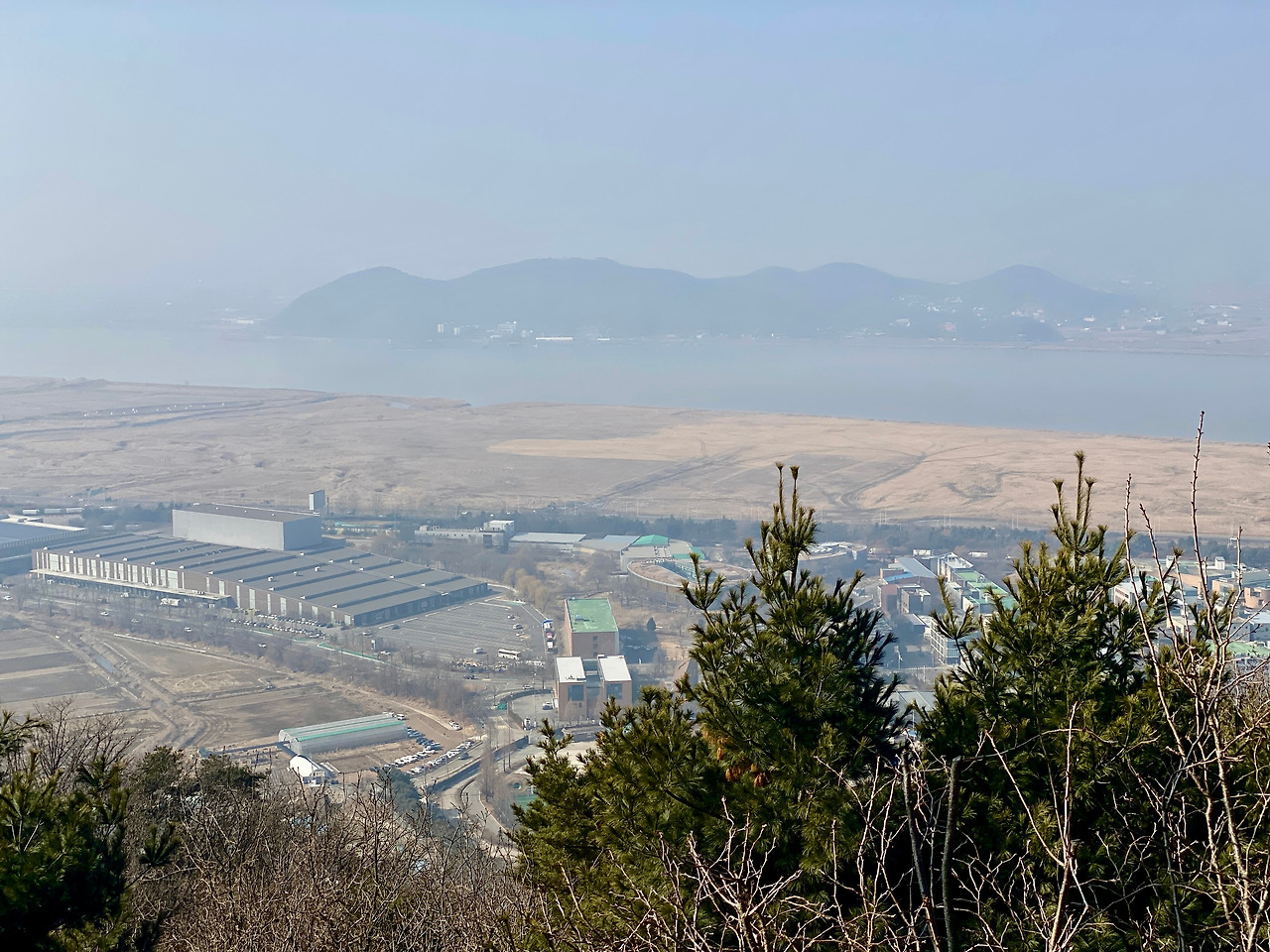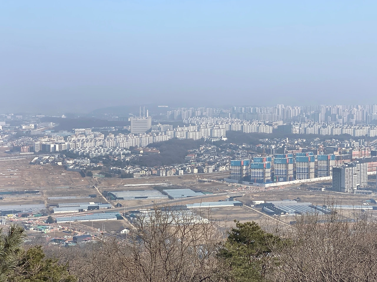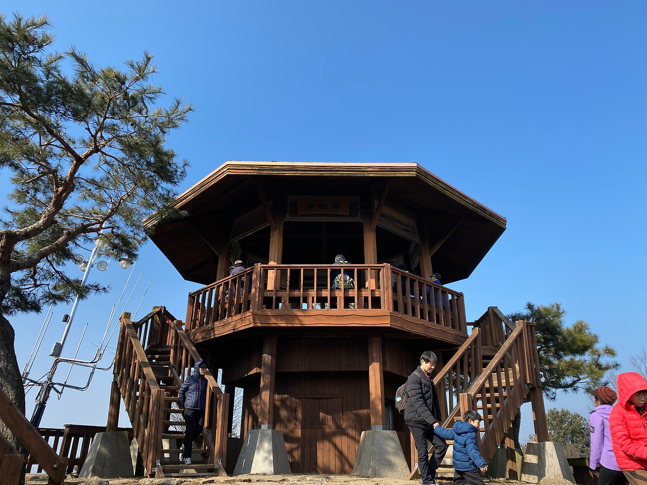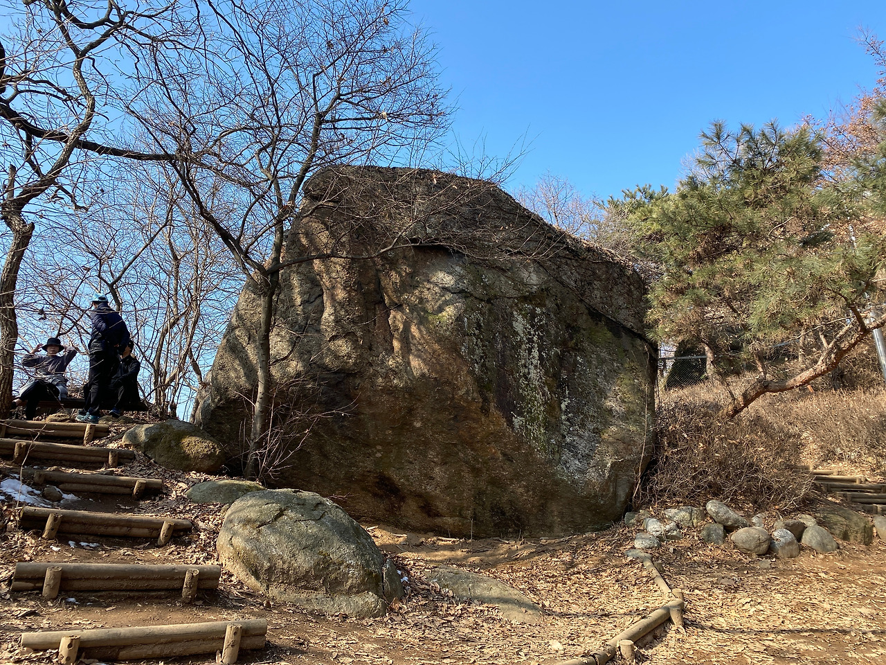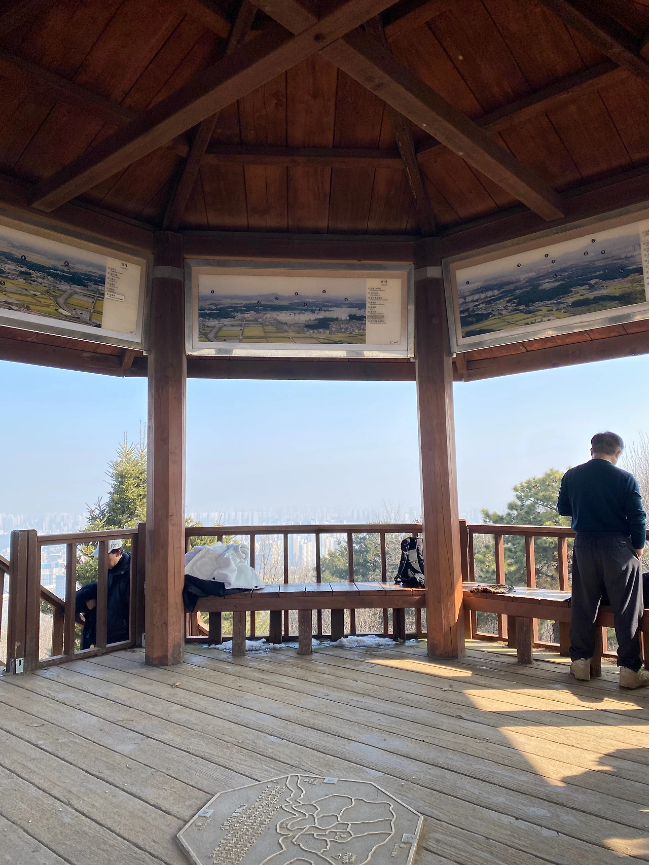 산 정상으로 가고 싶었는데 표지판이 명확히 정상을 가리키고 있지 않아 중간에 조금 헷갈렸다. 그래도 살아온 인생 짭밥이 있는데 이 정도는 찾아갈 수 있지 않을까 하는 생각으로 어떤 때엔 감으로 방향을 잡기도 했다. 다행히 인생을 허투루 살지 않았는지 길을 잘 찾았다. 그렇게 오르다 보니 정상이 보인다. 정상 근처엔 여느 산에서 본듯한 큰 바위가 길목에 떡하니 있다. 큰 바위를 지나 위를 올려다보니 정자가 보였다. 잘 만들어 놓은 나무 계단을 구불구불 오르니 얼마 안 가 정상에 도착했다. 사람들이 꽤 있다. 저마다 숨을 돌리며 장난감 같은 산 아래 풍경을 보며 대화를 나눈다. 확실히 산 정상에 오르니 마음이 탁 트인다. 비록 초미세먼지가 가득한 날이어서 아주 먼 곳까지 선명하게 보이지 않지만 그래도 좋았다. 낯익은 파주출판단지와 한강이 보이고 그 너머에 흐리게 김포가 보였다. 날이 좋았다면 그 이상도 보였을 것 같다.
