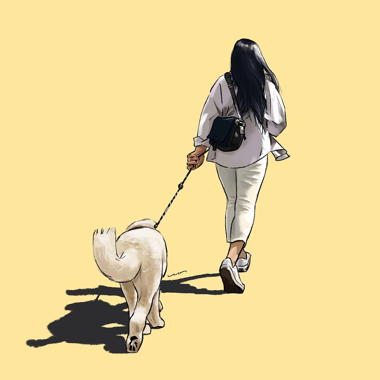 오전 10시가 되기 전 그즈음 아직 하루를 맞이할 준비가 덜 된 어수선한 길거리. 털이 복슬복슬한 큰 개를 만났다. 이 사람 저 사람, 이리저리 다니며 킁킁킁 인사를 한다. 반가운 마음에 양해를 구하고 아주 잠깐 쓰다듬어 주고 아쉬운 마음에 사진을 찍었다. 한참 뒤 사진을 보니 주인과 개가 걸음걸이가 어쩌면 이리 똑같은지. 어수선했던 그 아침, 분주한 나와 우리에게 따뜻한 마음을 전해준 그 녀석이 생각난다.
