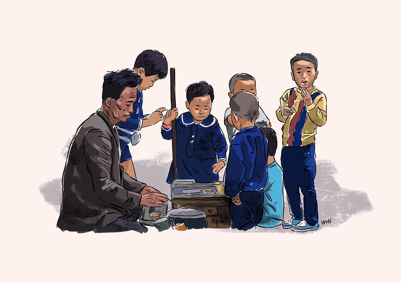 피곤한 듯 집중한 듯 달고나를 만들고 있는 아저씨와 달리 아이들은 요리조리 맛보기에 여념이 없다. 치킨, 피자가 어디 있나. 달콤한 달고나 하나면 충분했던 가난한 우리 옛 시절들. 추운 겨울이면 이가 탁탁 부딪힐 정도로 매서웠던 추위. 여름이면 선풍기 하나에 모여 미지근한 바람이라도 감사하며 맞았던 그때. 그 시절 참 가난했고 힘들었어도 지금 좋은 기억으로 남는 건 내가 어렸었기 때문일 것이다. 돈도 명예도 지위도 필요 없고 그저 달고나 하나 깨어 물면 그날 하루 참 행복했던 시절. 그 시절이 그리워 그림으로 남겨 본다.
