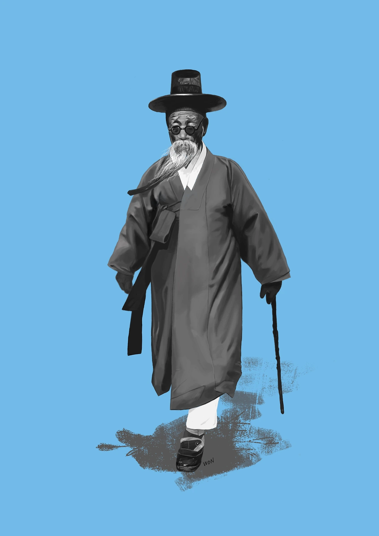 노인은 어딜 가고 있었을까. 끝없는 삶의 여정이 참 모질었을 텐데 노인의 걸음걸이는 아직 위풍당당하다. 투박한 지팡이와 두툼한 면장갑, 둥그런 안경과 긴 흰 수염, 그리고 머리에 쓴 갓. 조선 시대와 일제강점기를 거친 노인은 옛것과 새것이 혼합된 복장을 하고 있다. 그 시대를 겪으며 얼마나 힘들었을까. 역사를 잊은 민족에게 미래는 없다고 했다. 지금 대한민국은 훗날 다음 세대에게 어떤 시대로 기억될까. 우리가 잊어야 할 것은 무엇이고 기억해야 할 것은 무엇일까. 그리고 무엇을 남겨주어야 할까.