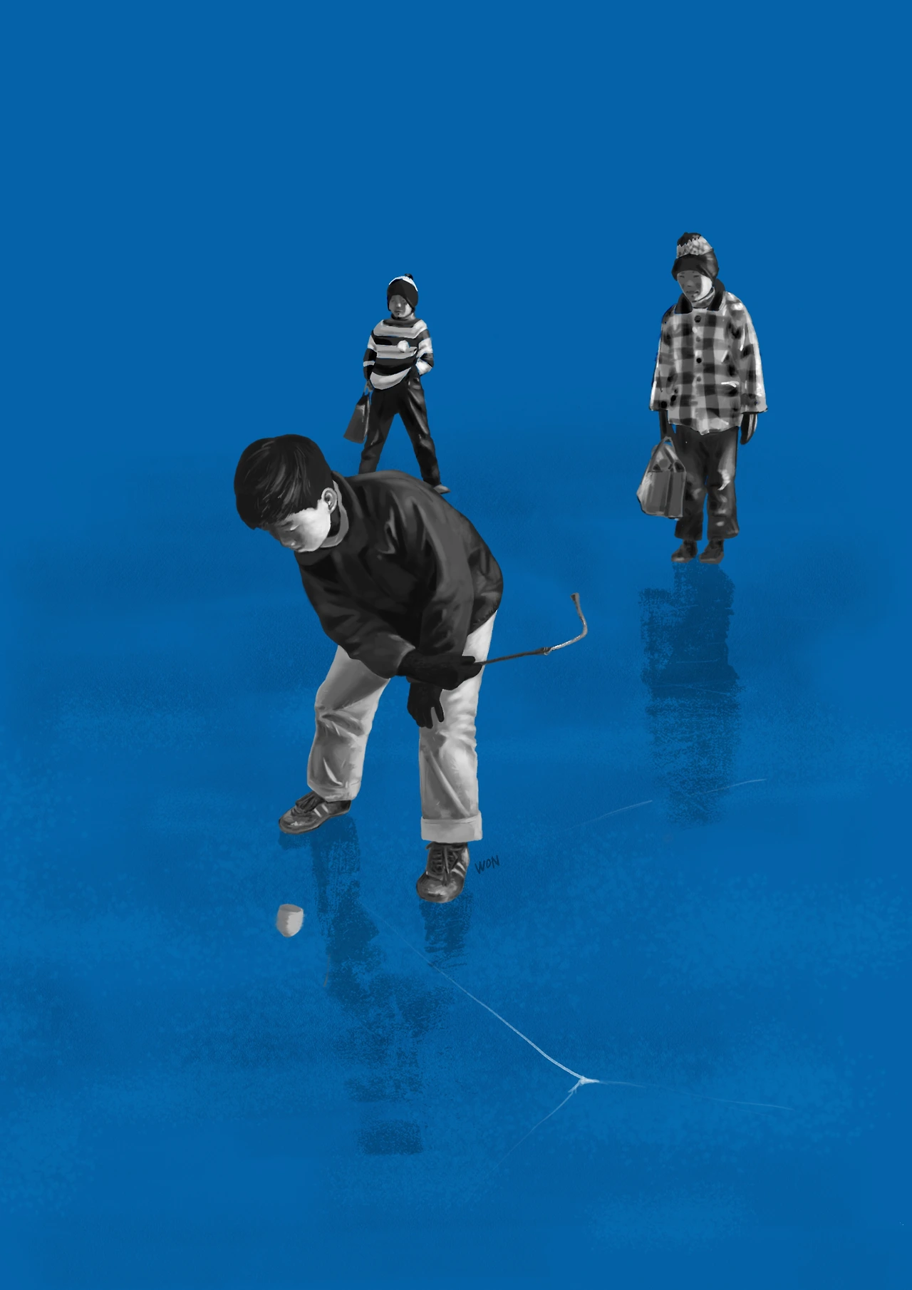 한겨울 냇가 얼음 위에서 팽이치기하는 아이와 뒤에서 부러운 듯 구경하는 아이들. 찰나였을 이 순간이 이토록 그립고 애잔한 건 왜일까. 뒤 왼쪽 친구는 남다른 분위기로 한껏 멋 부리며 서 있고, 오른쪽 친구는 그저 신기하고 부러운 듯 쳐다보고 있다. 팽이 치는 아이는 보란 듯이 진지하게 팽이를 치고 있다. 단단한 얼음판 위에서 뱅그르 돌아가는 팽이 하나로 웃고 떠들던 시절. 이때 참 좋았고 재미있었다.