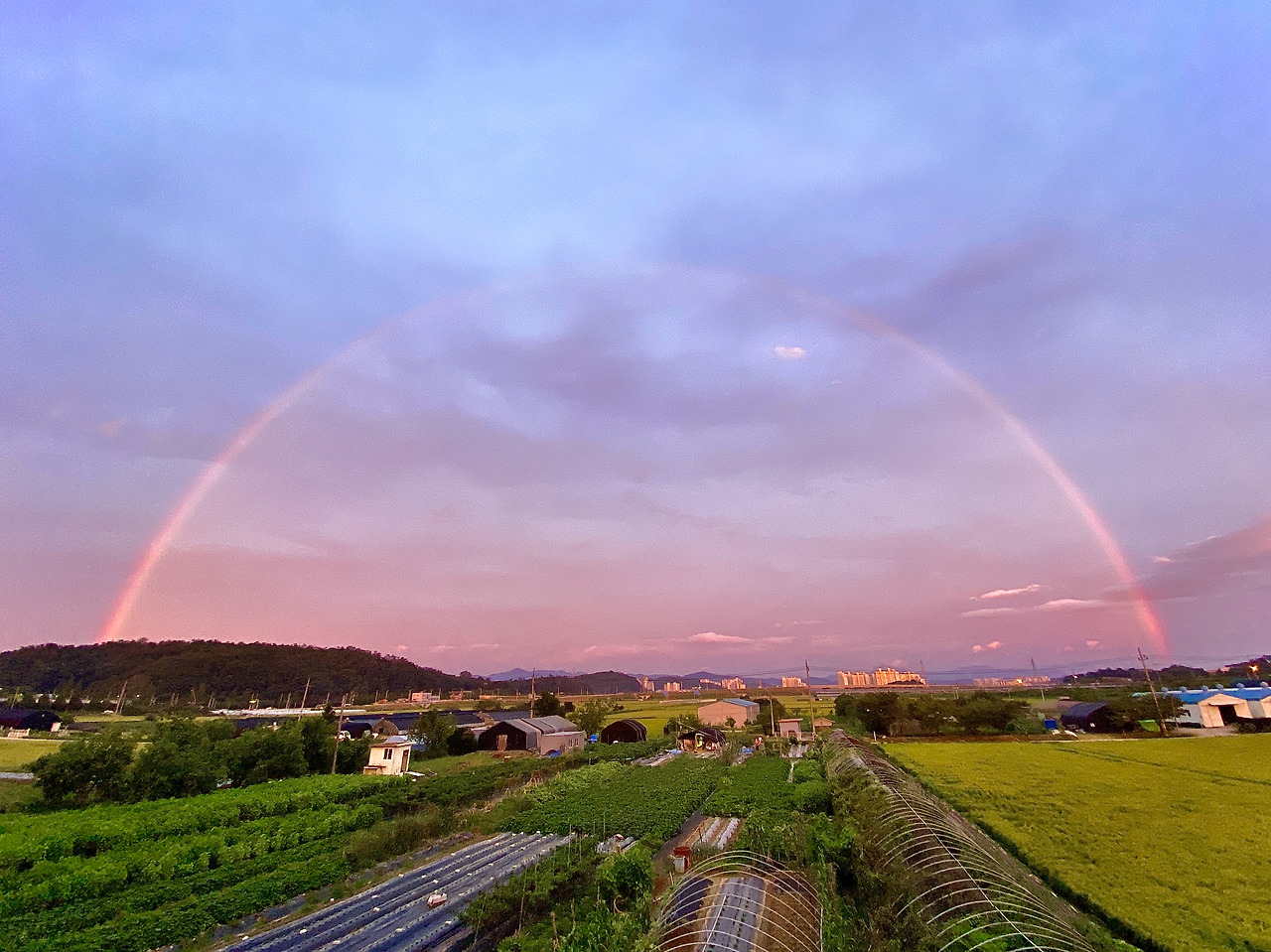 폭풍이 지나가며 비가 오다가 해가 뜨다가 오락가락한 날씨였던 날이 있었는데 그 날 내생에 가장 크고 선명한 무지개를 봤다. 사무실 근처였고 자가용을 타고 지나가다 마침 무지개가 보여 아들과 차에서 내려 스마트폰으로 연신 사진을 찍어댔다. 날씨가 그때까지도 조금 흐려 언제 사라질지 모르는 무지개였기에 마음이 다급했다.