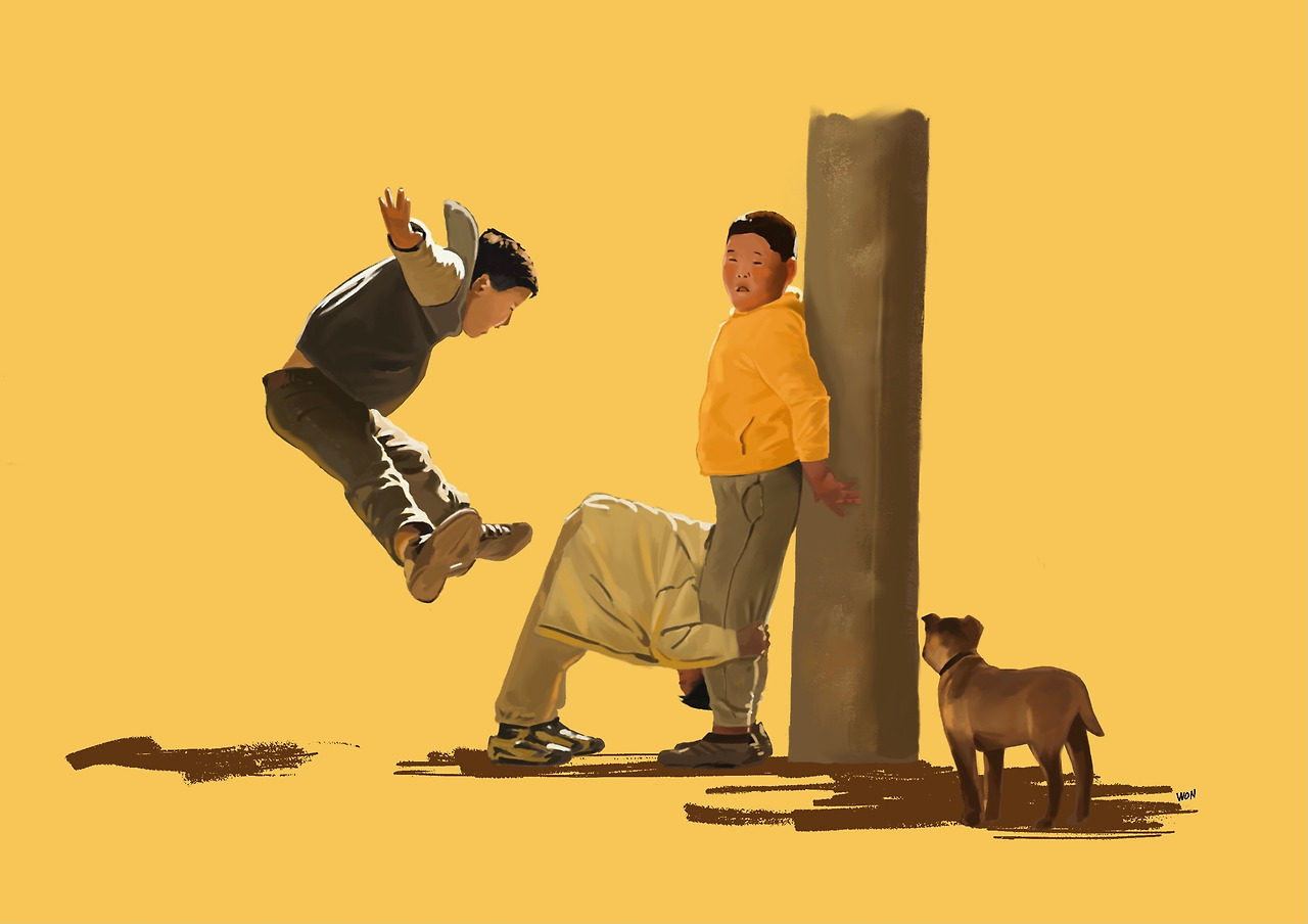 서두일 사진작가의 2004년작 <말뚝박기>라는 사진을 그렸다. 절묘한 순간이다. 어릴 적 말뚝박기는 복수에 복수가 이어지는 재미있지만, 꽤 무서운 놀이었다. 아무 걱정 없던 그 시절. 스마트폰도 컴퓨터도 없던 그 시절. 그래도 좋았다. 해 질 때까지 뛰어놀던 골목길이 놀이터였고 서로 부딪히고 숨고 뛰어다니던 친구들이 있었다. 그렇게 놀다 저녁을 먹던 기억들. 가난했지만 다시 가고픈 시절이다.