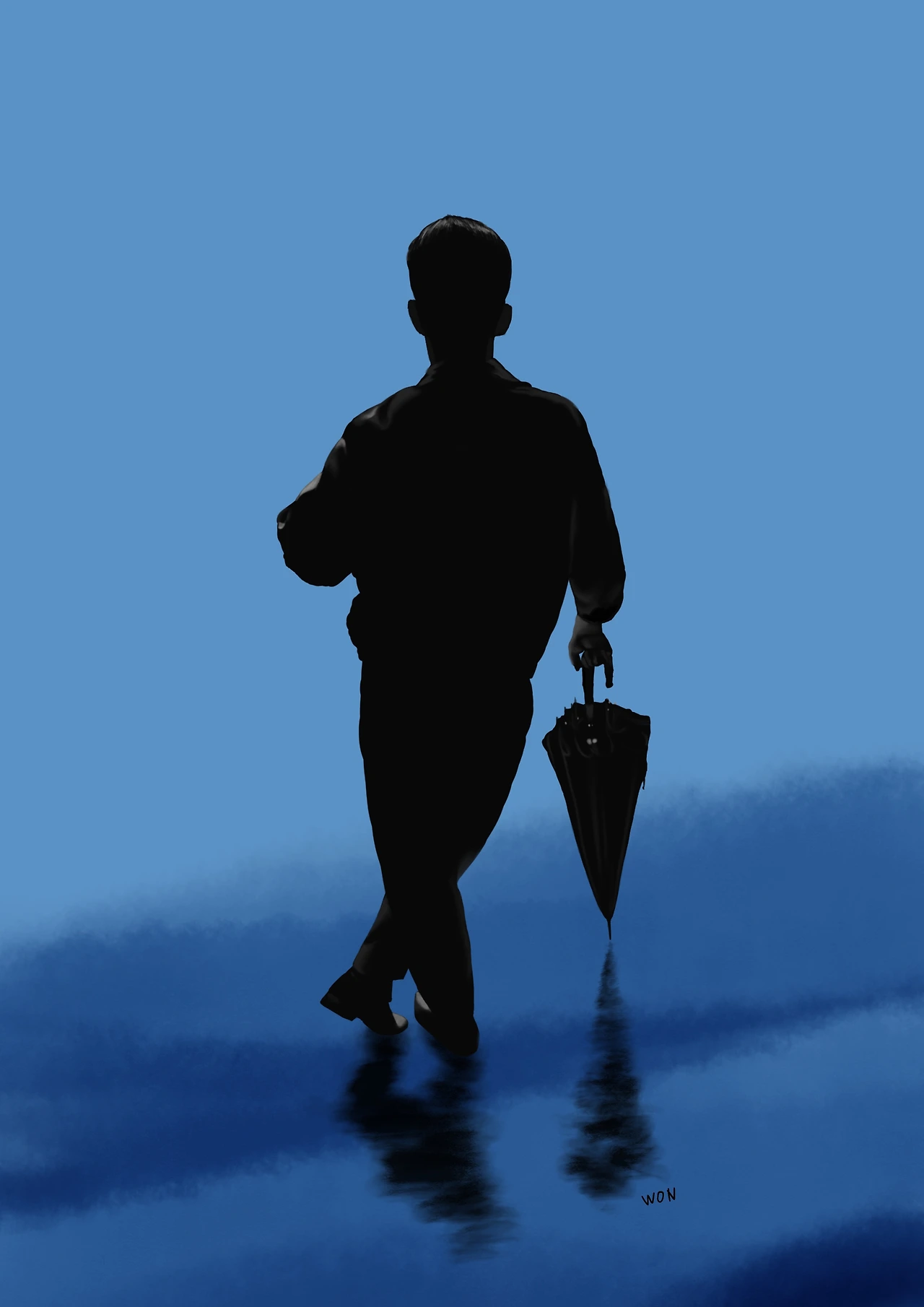 한영수 작가님의 사진을 그렸다. 원작 사진에는 비 오는 날 건물 안에서 밖을 보고 있는 남자의 뒷모습과 바로 옆에는 줄에 묶인 개가 있다. 거리에는 많은 사람들이 오고 간다. 흑백 사진이지만 청량한 느낌과 일상의 잔잔함, 위트까지 있다. 역시 사진작가가 바라보는 시선은 남다름을 느낀다.