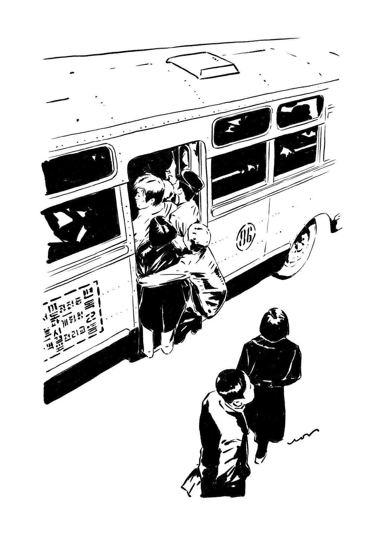 사람이 너무 많아 버스를 그냥 보내야 했던 시절. 매연 냄새 풀풀 나는 버스 정류장엔 담배 피우는 아저씨, 짐보따리 머리에 이고 있는 아주머니, 무거운 책가방을 메고 있는 학생 등이 모여 이번엔 버스를 탈 수 있을까 생각하며 버스가 서는 곳에 따라 이리 갔다 저리 갔다 파도처럼 철썩였다. 승용차는 꿈도 못 꾸던 우리 집은 시장에 가든 친척집에 가든 언제나 버스를 이용했다. 심지어 난 버스 기사가 운전하는 걸 어깨너머로 보고 운전을 익혔을 정도다. 만원 버스에 운 좋아 자리라도 나서 앉으면 어찌나 몸이 노곤노곤 기분 좋은지 그날은 운 좋은 날이다.
