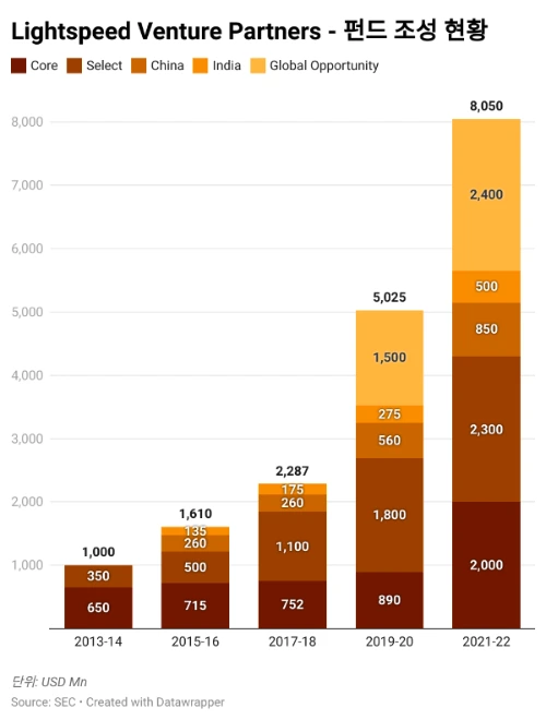 LVP가 올해 조성한 $7Bn 규모의 펀드는 코어, 셀렉트, 오포튜니티, 인도 펀드 총 네 개로 구성됩니다.