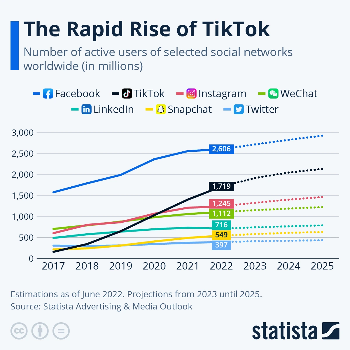 틱톡은 전 세계 어떤 소셜 앱보다도 빠른 이용자 증가 속도를 보이고 있습니다. 2021년 이미 '페이스북 + 인스타그램 + 와츠앱'을 보유한 메타 매출의 3분의 1 수준으로 올라온 틱톡의 매출은 지금 추세라면 향후 2 - 3년 내로 메타를 추월할 가능성도 점쳐지고 있습니다.