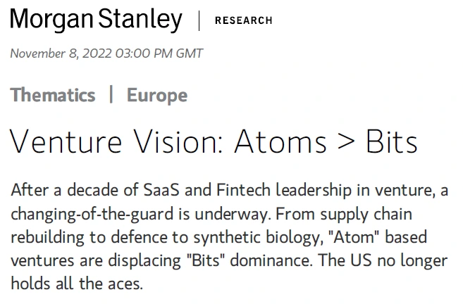 작년 11월 모건스탠리 영국사무소의 리서치 데스크에서는 재미난 리포트를 하나 발간하였습니다. 바로 지난 10년 간 전 세계 벤처투자의 헤게모니를 장악했던 소프트웨어, 클라우드, 핀테크와 같은 컴퓨터 '비트'에 의존했던 산업에서 공급망, 에너지, 기후테크와 국방 및 보안과 같은 국가 기간 산업 및 실물 자산과 연관된 '아톰'의 분야로 옮겨가고 있다는 내용입니다.