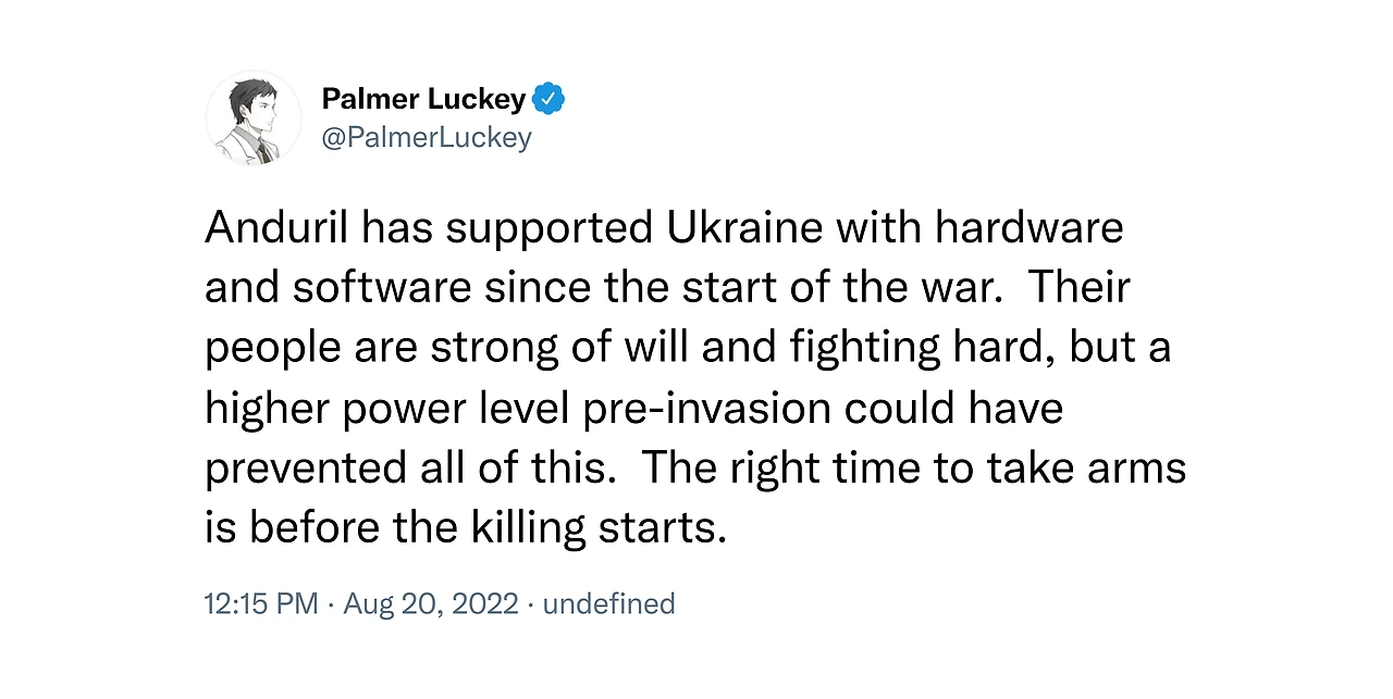 Anduril의 창업자 팔머 럭키는 지난 8월 트윗을 통해 우크라이나 - 러시아 전쟁과 관련하여 우크라이나 정부와 긴밀히 협력해오고 있다고 공식적으로 밝히기도 하였습니다. 압도적인 기술적 우위가 국제 분쟁을 막을 수 있다고 믿는 팔머는 이미 20대 초반에 오큘러스를 창업하여 페이스북에 매각한 이력까지 더해지며 실리콘밸리의 이단아에서 제2의 일론머스크로 주목받고 있습니다.