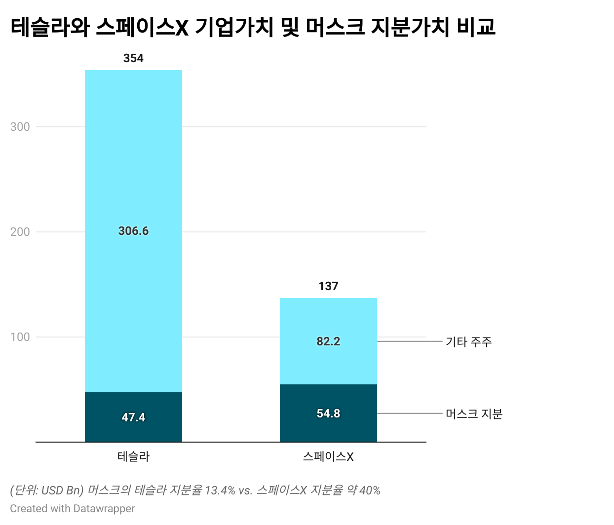 머스크가 보유한 테슬라 지분은 옵션을 제외할 경우 약 13.1% 수준입니다. 작년 연말 시가총액을 기준으로 환산할 경우 보유지분의 가치는 약 60조 원 수준으로 추산됩니다. 반면 스페이스X의 경우 2020년 정부 입찰 문서에 명시된 머스크의 지분율은 47.8%, 그리고 의결권 보유 비중은 78.4%에 달합니다. 이후의 지분 희석을 고려하더라도 머스크의 지분율은 아직까지 40% 내외일 것으로 추정됩니다. 이제는 머스크의 스페이스X 지분가치가 이미 테슬라 지분가치를 넘어섰을 가능성도 점쳐집니다.