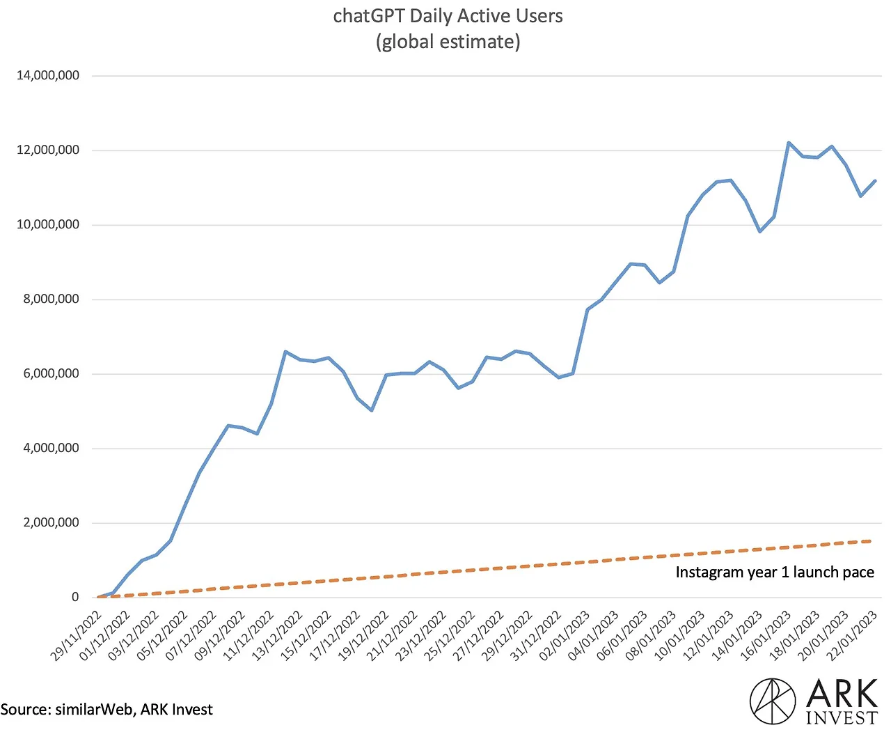 OpenAI의 기술이 혁신적인 것인가에 대한 논쟁이 있지만 정작 OpenAI의 가장 큰 기여는 '대화'라는 방식을 통해 AI 서비스의 대중화 시대를 열었다는 것입니다. 출시 5일만에 백만 사용자를 넘어섰던 ChatGPT는 이제 출시 40일만에 일일 사용자 천 만명을 돌파한 것으로 집계되고 있습니다.