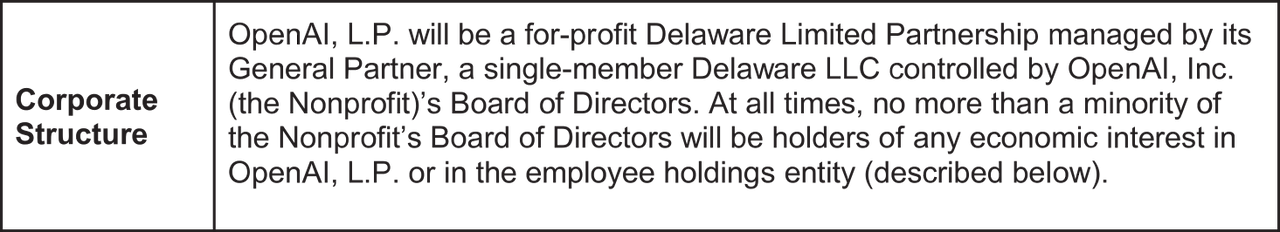 OpenAI는 비영리재단이 영리법인을 세워 활동할 경우 발생할 수 있는 이해충돌 및 규제 위반 이슈를 우회하기 위해 영리법인인 자회사에 이익상한(Capped Profit)이라는 개념을 도입합니다.