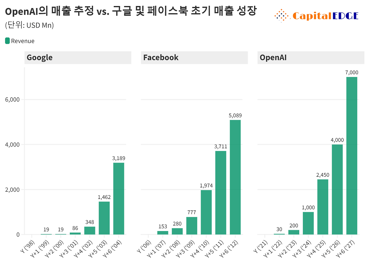 유료서비스 출시 이후 1조 매출 돌파에 걸린 시간은 구글이 5년, 페이스북이 4년입니다. OpenAI는 2022년 ChatGPT 출시를 통해 2024년 1조 매출을 기대하며 해당 기간을 3년으로 단축하겠다는 목표입니다.