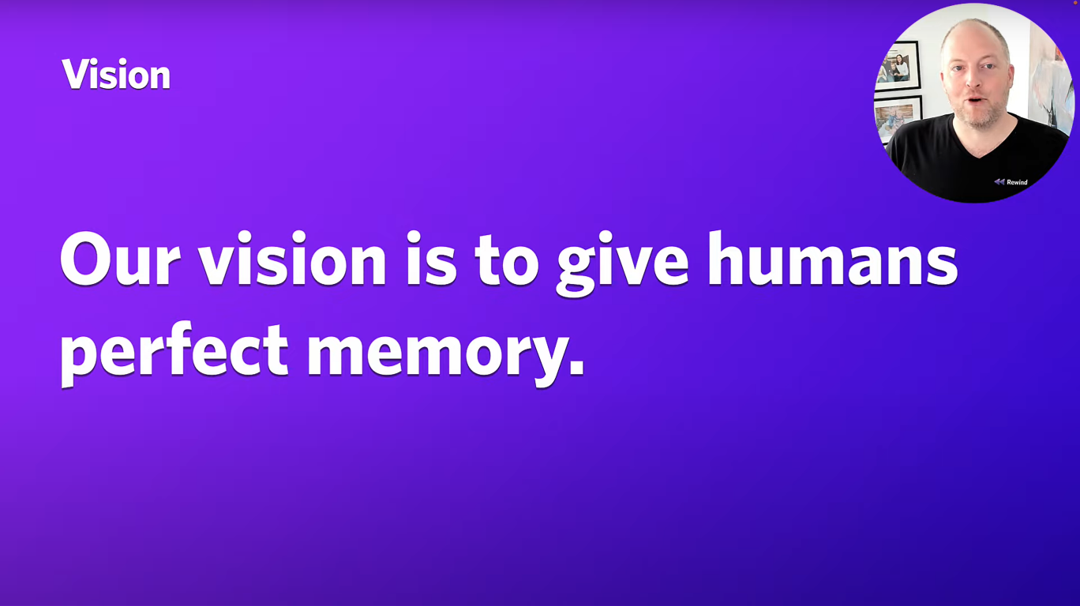 옵티마이즐리가 인간이 가진 무의식의 인지 및 반응에 관한 스타트업이었다면 Rewind AI는 기술을 통해 인간이 가진 기억력의 범위를 확장하는 미션을 가진 스타트업입니다. 최근 주목을 받고 있는 '세컨드브레인'의 자동화 버전이라고도 볼 수 있습니다.
