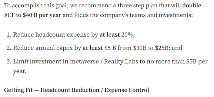 2022년 10월 24일, 테크 전문 크로스오버 펀드를 표방하는 알티미터(Altimeter) 캐피탈은 메타(Meta)에 보내는 공개 서한을 통해 이제는 미래산업에 대한 과도한 투자를 제한하고 다이어트에 나설 때라고 경고하고 나섰습니다. 그러자 메타는 2022년 11월 곧바로 창립 이래 최초의 대규모 구조조정에 나서며 주주들의 제안에 적극 호응하였습니다. 시장으로부터의 신뢰를 회복한 메타는 2023년 주가 반등에 성공, 올해만 2배 이상 주가가 상승하는 저력을 보여주었습니다.
