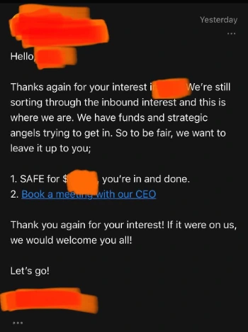올 3월 W21 데모데이 직후 주목을 받았던 트윗이다. 요약하자면 "투자하고자 하는 곳이 굉장히 많으니 일단 Post-money Cap $100M SAFE에 서명을 하고 CEO와 미팅을 잡으라"는 내용이다.