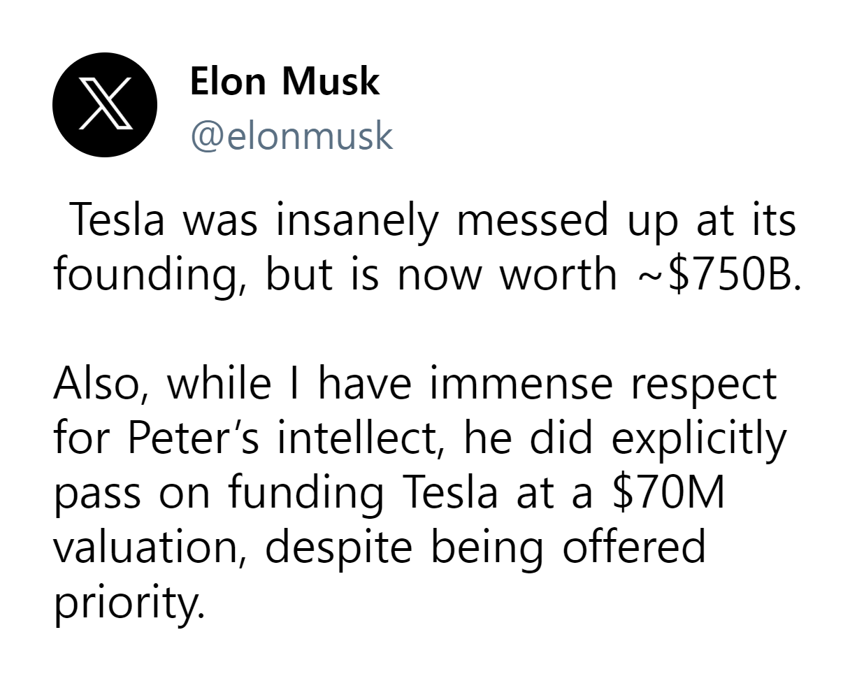 피터틸은 2008년 스페이스X에 대규모 투자를 결정하였지만 일론 머스크의 또 다른 스타트업인 테슬라에 대한 투자는 거절합니다. 피터는 2015년 DealBook 포럼에서 '스페이스X는 독점적 경쟁력을 가졌지만 테슬라는 여러 전기차 기업 중 한곳에 불과했다고' 자신의 결정을 합리화하기도 하였습니다. 하지만 역발상 투자의 대가도 이 시대 최고의 역발상 투자는 놓치고 만 것입니다.