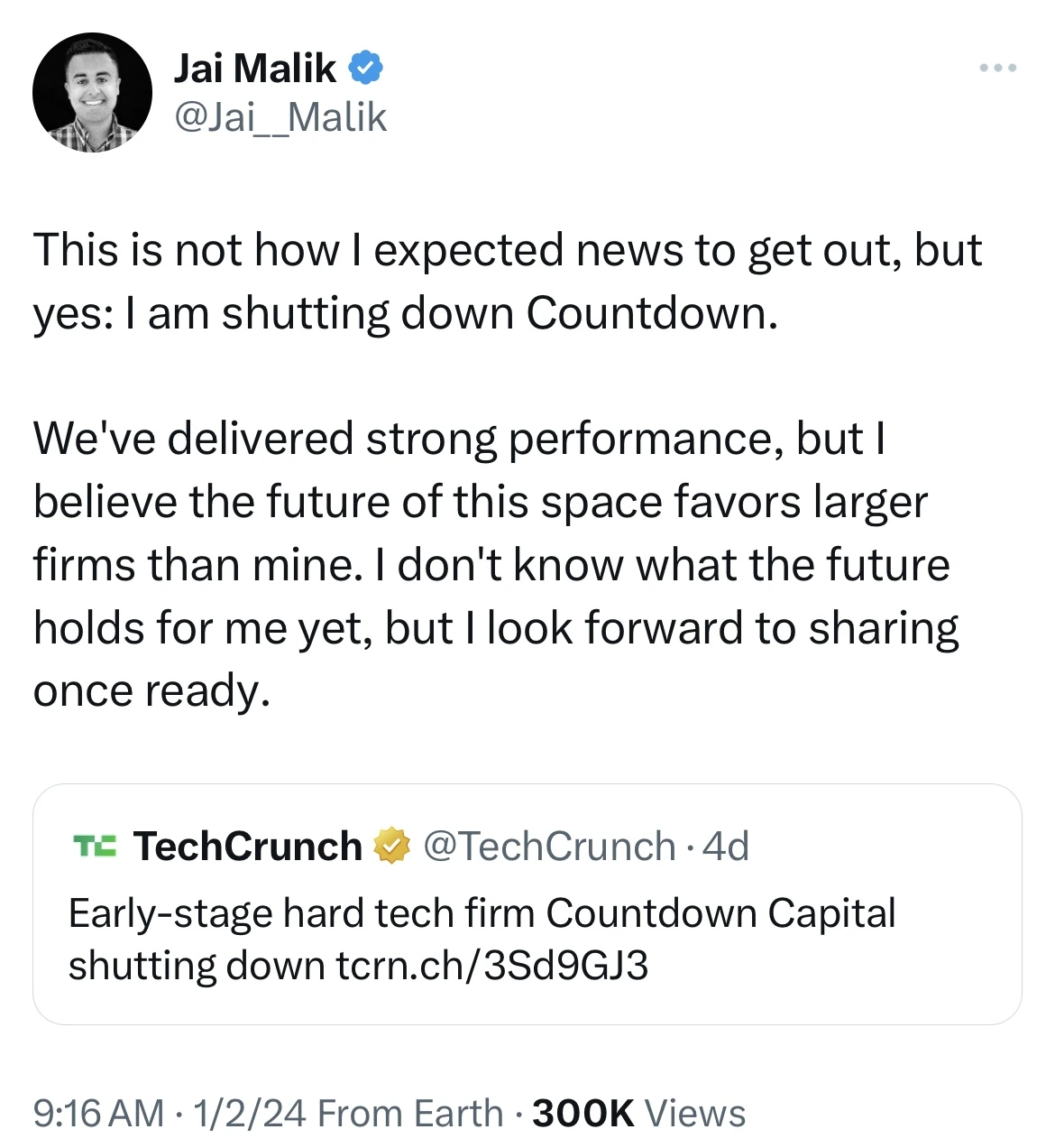 카운트다운 캐피탈을 이끌어온 제이 말릭 (Jai Malik)은 펀드 폐업을 결정한 핵심 이유로 소규모 펀드로서의 한계를 언급하였습니다. 특히 사업 초기부터 대규모 자금이 필요하고 사업이 본 궤도에 오르기까지 오랜 기간이 소요되는 딥테크 분야의 특성상 소규모 펀드가 대형 펀드와의 경쟁에서 유의미한 투자 성과를 창출하기에는 한계가 명확했다는 자기반성입니다.