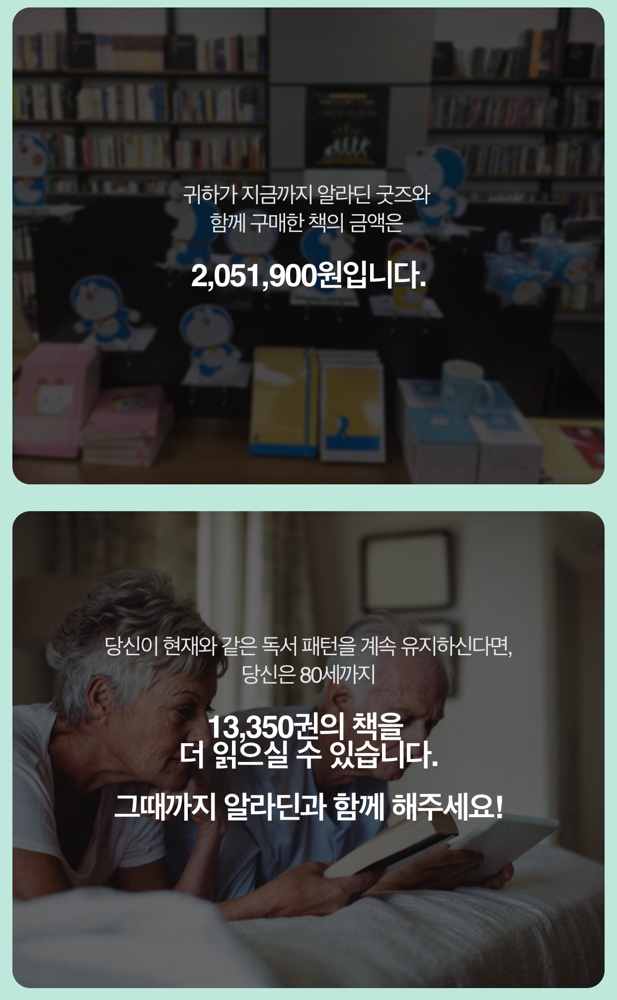 구매 기록을 보여주는 것도, 이미 구매한 도서를 다시 구매하려고 할 때 알림을 띄워주는 것도, 내가 얼마쯤 사고 있고, 어느 정도 읽고 있는지 알려주는 것도 알라딘뿐이다.