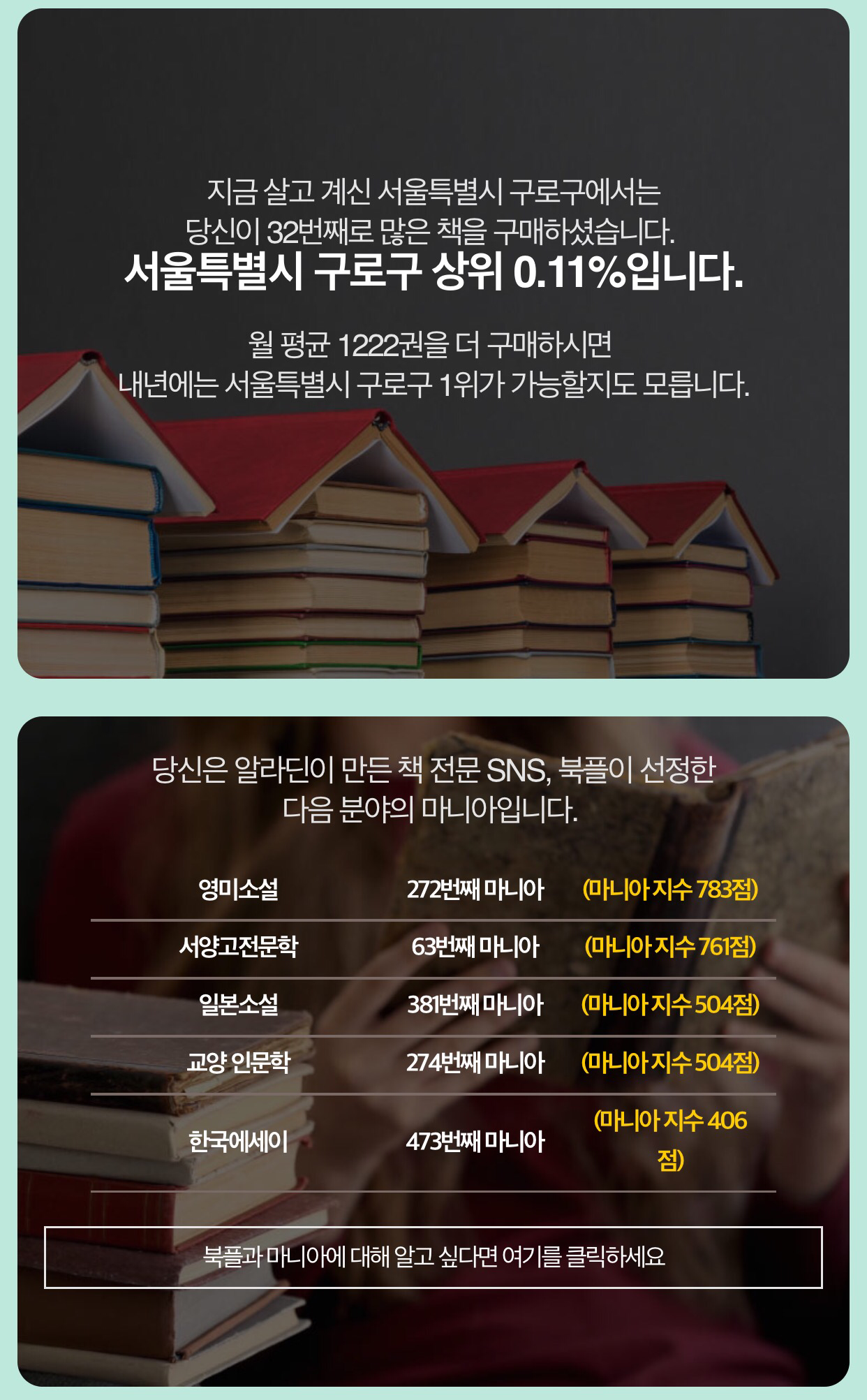 이건 좀 웃기는 일인데 구로구에서 32번째로 많은 책을 구매하는 사람이 나라고 한다. 솔직히 믿을 수가 없다. 고작 한달에 25권을 사는 내가 132번째도 아니고, 32번째라는 걸 어떻게 간단히 납득할 수 있겠는가.