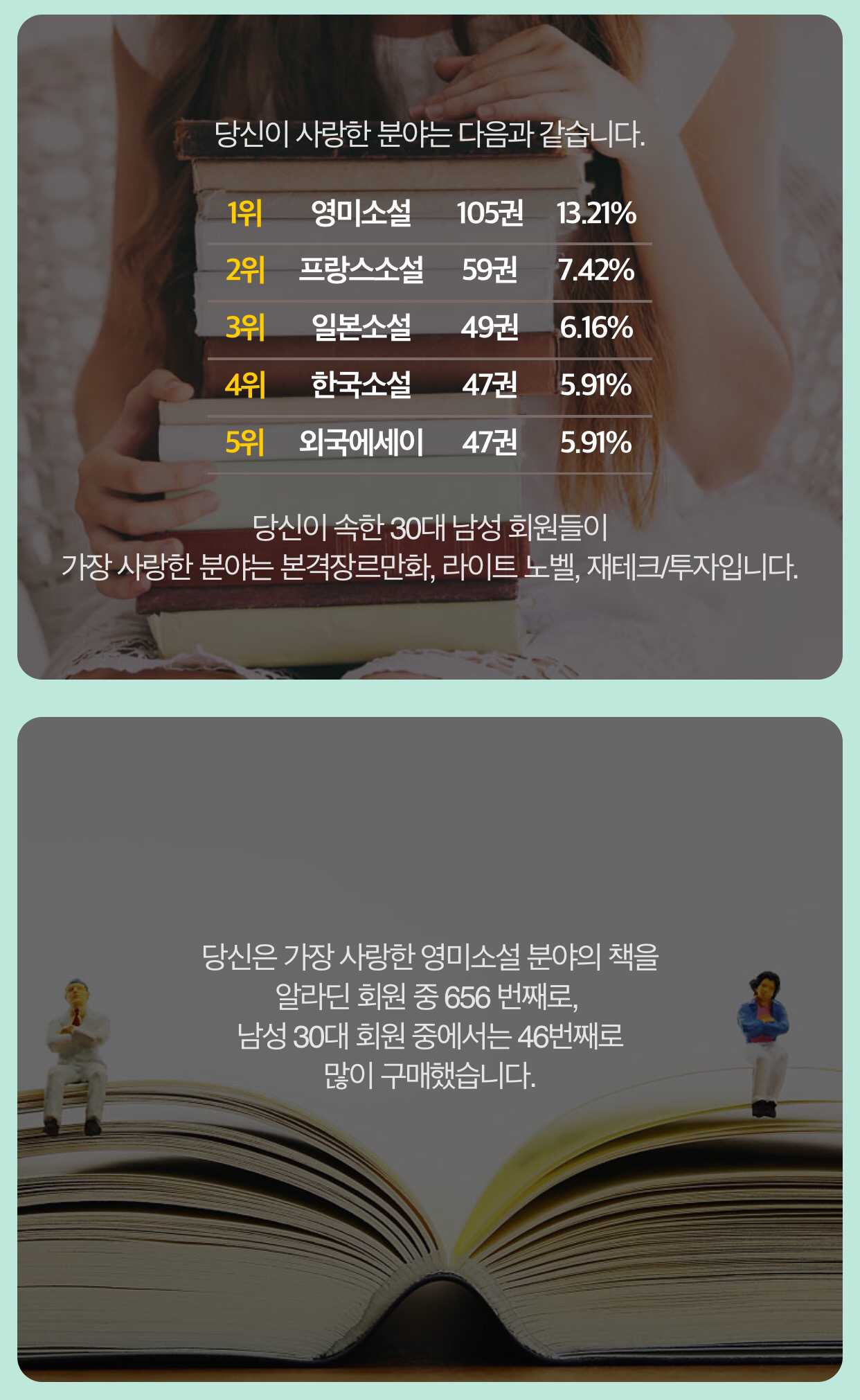 내가 속한 30대 회원 그룹에서 가장 인기 있는 분야는 '본격 장르 만화, 라이트 노벨, 재테크/투자'였다. 내가 전혀 읽지 않는 책들이다. 기막힐 정도로 취향에 반대되는 결과를 보며 조금 납득할 수 있었다.