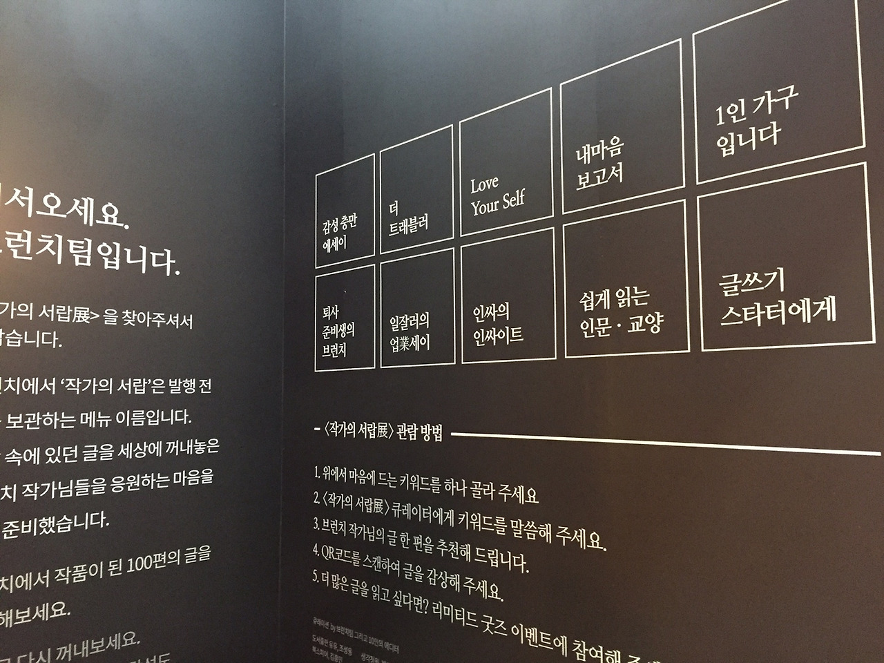 브런치 책방, 작가의 서랍展은 브런치 앱 공지에서 봤지만 어떤 느낌으로, 무엇을 보여주려는 건지 알기 어려웠습니다. 그래서 직접 가봤는데 여기서는 아쉬웠던 점 보다는 긍정적이었던 부분을 들여다 볼게요. 딱 한 가지 크게 아쉬웠던 건 주제를 고르라고 하고서는 제가 고른 주제 콘텐츠가 아니라 큐레이가 고르고 싶은 걸 골랐다는 거였거든요. 하지만 그 역시 '누군가가 내 얘기를 듣고 골라준 이야기'라는 부분에 의미를 부여한다면 상쇄될 수 있다는 걸 한 번 더 느끼게했습니다.
