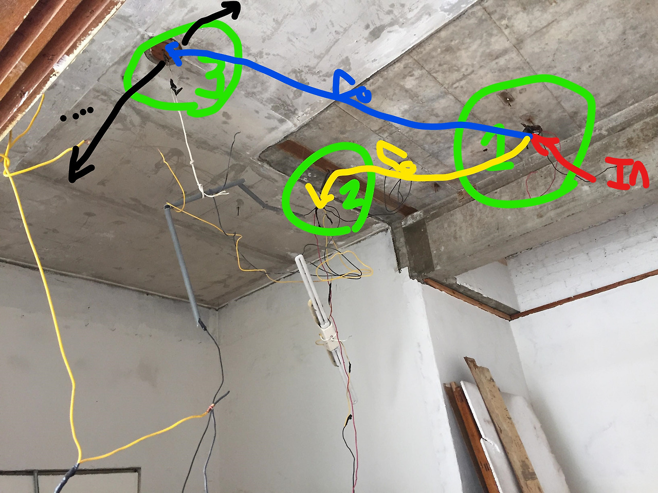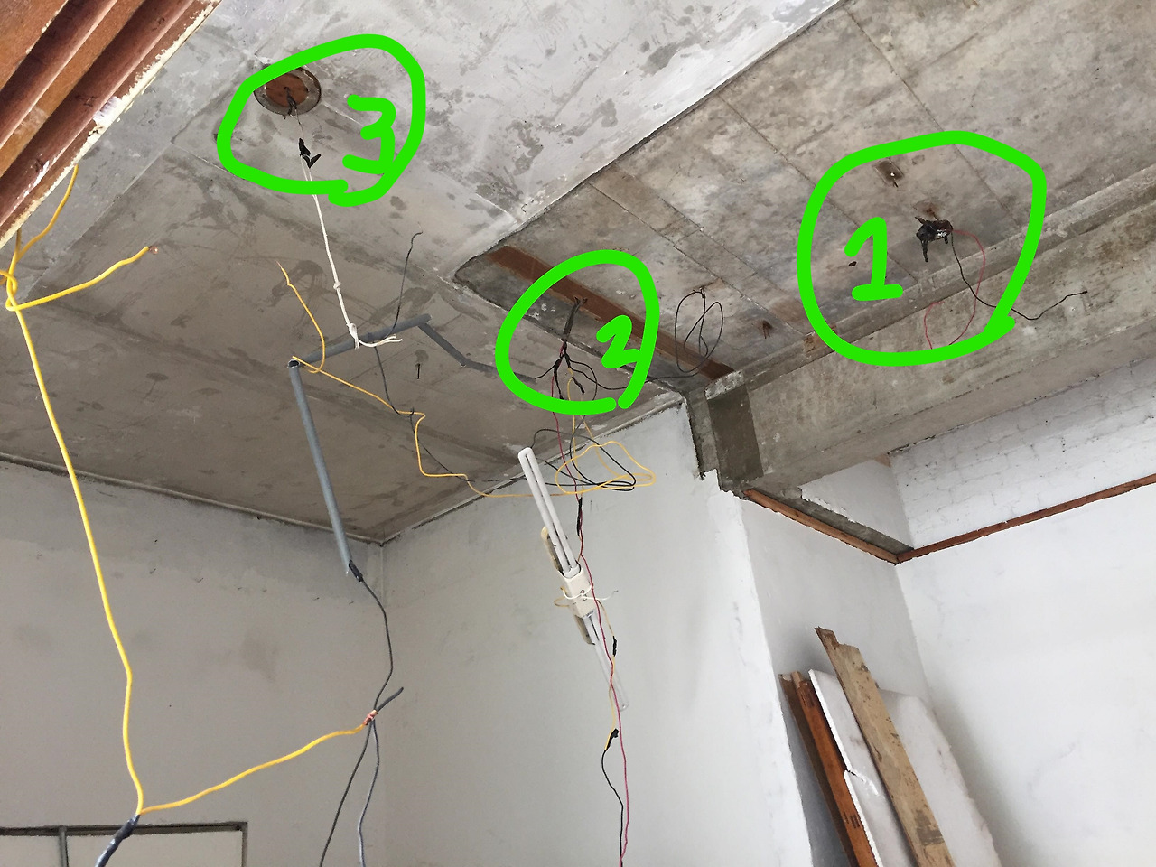 천정을 뜯고 보니 천정 벽에서 전선이 나와있는 곳이 세 곳이더군요.