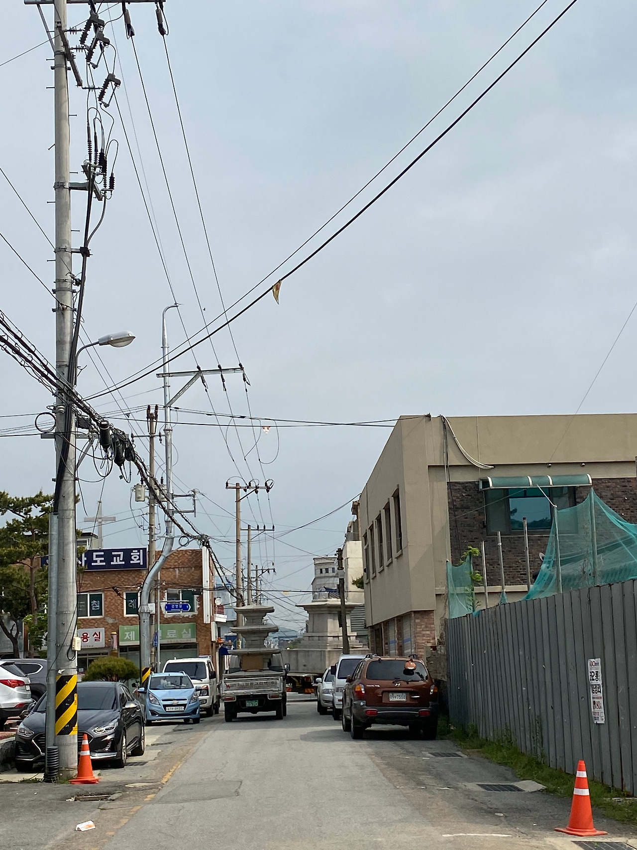 탑을 싣고 가는 차는 도망치듯 서둘러 떠나버렸다.