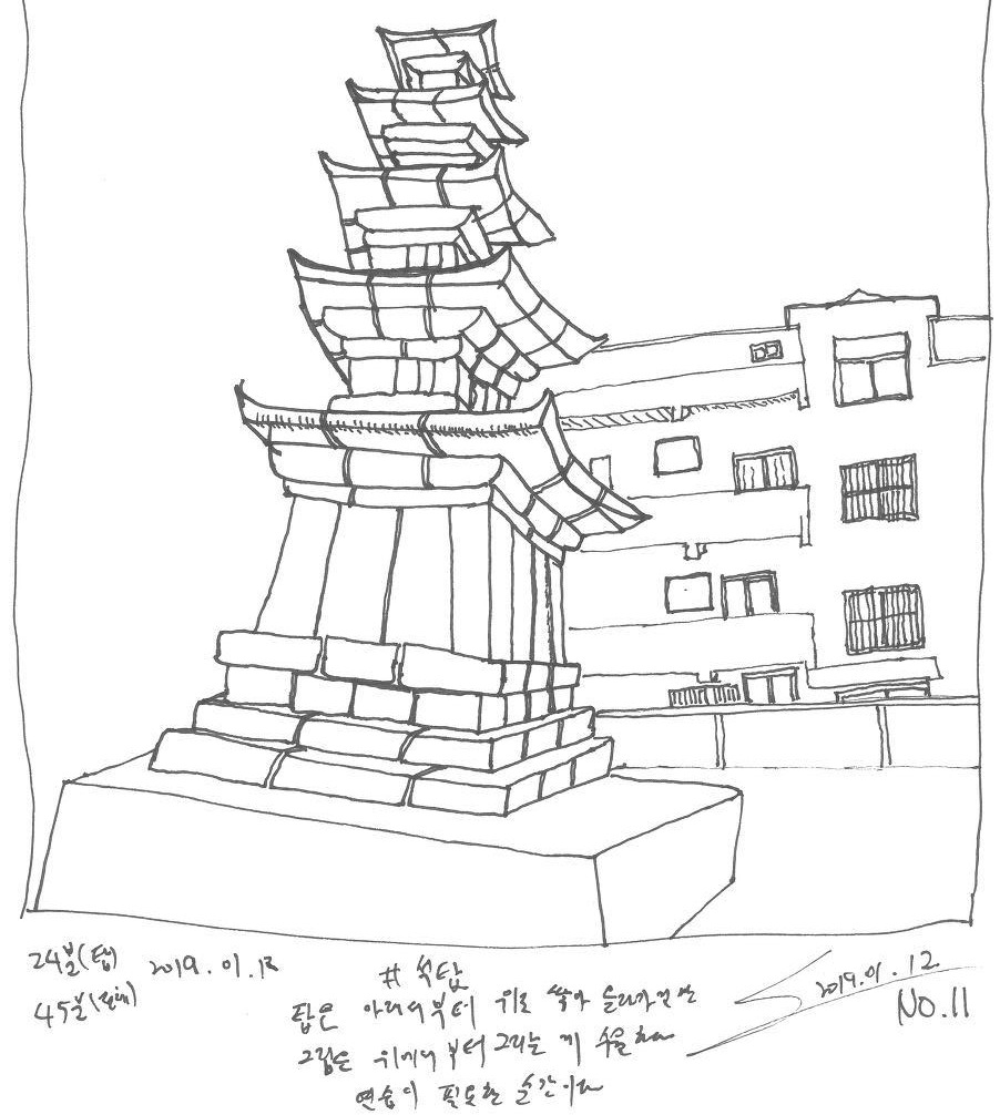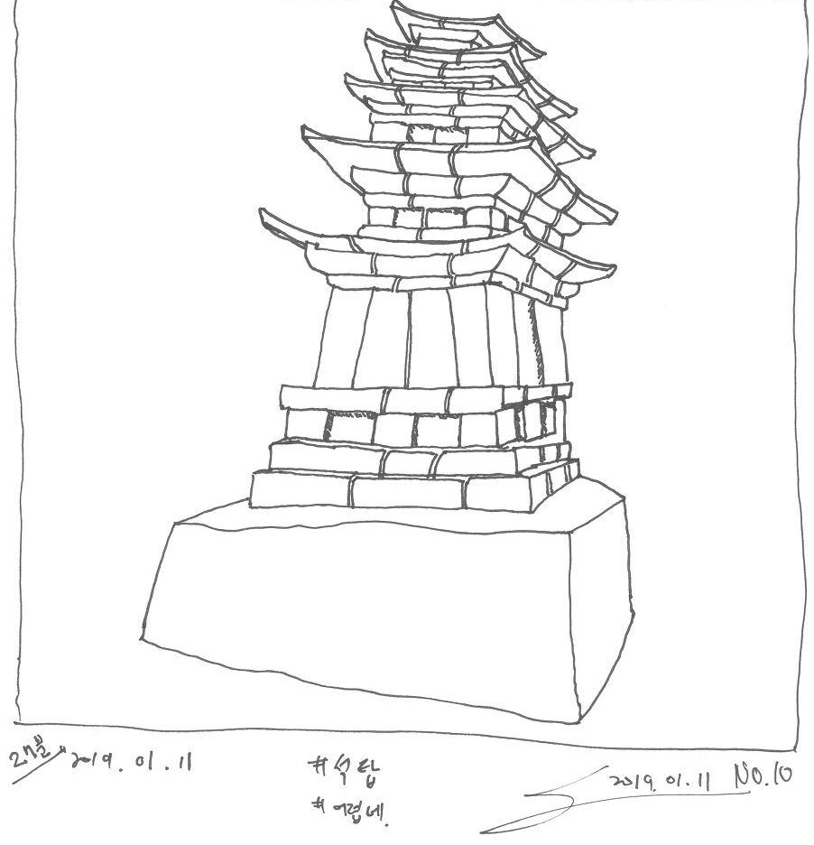 봉황재 다음으로 그린 몇 개의 드로잉은 실패였다. 같은 대상에 다시 도전했지만 한 번 더 실패했을 뿐 별로 나아지지 않았다. 그렇다고 그리기를 포기하거나 그만두지는 않았다. 배운 적 없고, 서툴기에 어떻게 하면 좋을지 모를 때가 많고, 실수 역시 흔한 게 당연하기 때문이다. 대신 실패를 없던 것으로 하지 않고 가능한 방법 혹은 사소한 깨달음을 남기려고 노력해봤다. 그 과정에서 얻은 교훈은 '비율이 좋은 대상을 그리는 건 어렵다'는 거다. 기막힌 균형을 자랑하는 석탑이나 완벽한 균형을 보이는 대상들은 조금만 서툴러도 몹시 이상하게 일그러져 보이는 게 당연하다고 받아들였다.