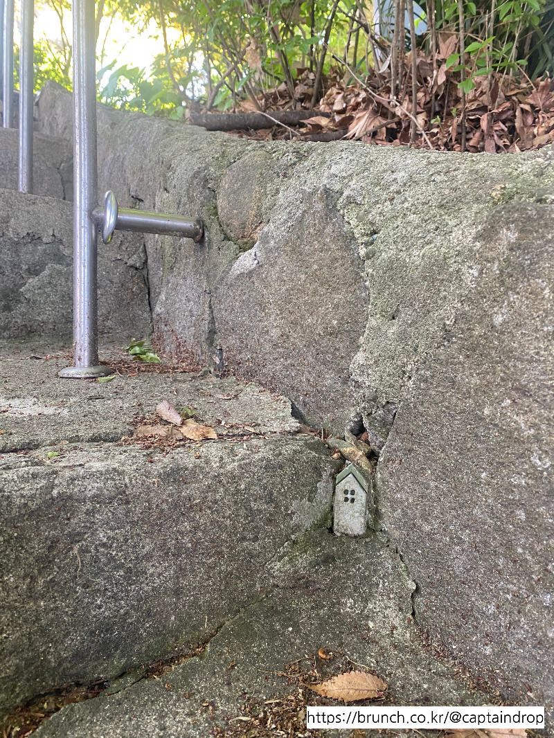 아이가 다니는 유치원으로 올라가는 계단에서 작은 집을 발견했다. 두 달이나 지나서야 우연히 보게 됐는데 그 후로는 매일 눈에 들어온다. 처음 발견하기 전까지는 없는 것이나 다름없었는데 한 번 보인 후에는 의식하지 않아도 매일 보인다는 게 이상하다. 내 눈에 무슨 일이 벌어진 걸까. 마치 그전까지는 소리 없이 죽어있다가 어느 날부턴가 소란스럽게 살아있는 것만 같다. 아이에게 이런 집을 찾았다고 알려줬더니 우연히 함께 등원하게 된 친구에게도 보여준다. 친구는 앞서 가느라 보지 못했지만 아이 아빠가 보고 '작은 집이 있네'했으니 멀지 않은 날 혹은 언젠가 다른 이에게도 여기에 작은 집이 있다는 사실이 전해질지도 모른다.
