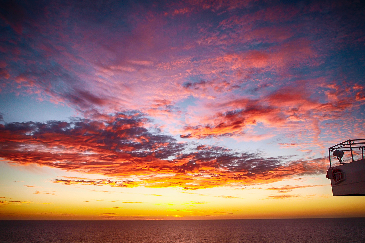 새벽의 운동량이 좀 미진한 생각이 들어, 밝게 떠오르는 보름달과 같이 아직 수평선을 넘지 않은 채 걸려있는 뜨겁지 않은 태양을 보며, 어차피 오늘 하루의 마지막 금식인 저녁 식사를 피하려는 뜻도 함께하여 모두가 식사하는 시간을 택하여 저녁 운동에 나섰다. 귀에 익은 주기관과 발전기가 내는 항상 곁에 있던 소음들이, 선수 쪽으로 갈수록 점점 멀어지며 잦아드니 그렇게 조용해지는 것과 비례하여 공기 역시 점점 맑아져 간다.
