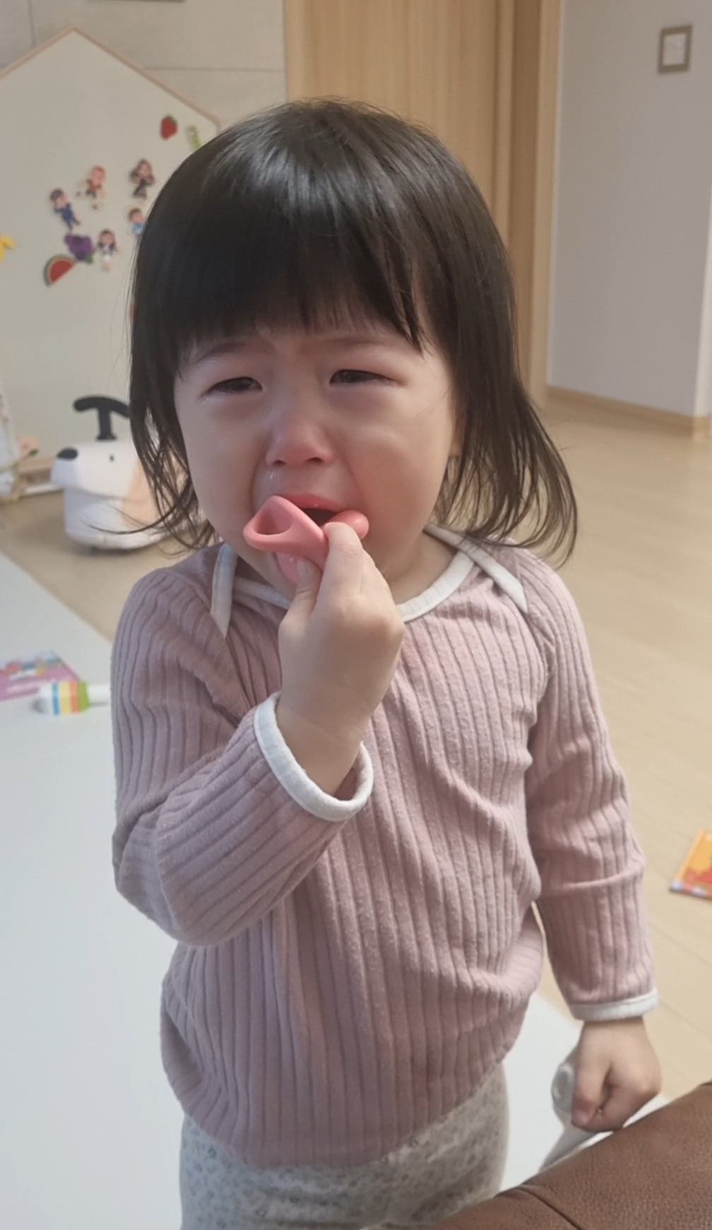 '설마...'라는 생각은 '진짜'가 되어 나타났다. 아이는 잠들기 전까지 팔을 휘두르고 발길질을 해대며, 그간 참아왔던 온갖 짜증을 선보였다. 새벽에는 침대를 뛰쳐나와 또다시 오열 파티를 하더니, 엄마 옆에서 울다 지쳐 잠들었다. 그렇게 연휴 내내 아이는 자야 하는 시간마다 세상이 무너지는 듯 통곡을 하며 자다 깨기를 반복했다. 아이에게 쪽쪽이는 정말 세상 그 자체였고, 그 세상과 이별하기 위해 처절하게 아픔을 겪어내는 듯 보였다.