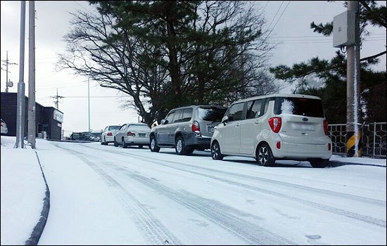 앞차가 지나간 자리는 눈이 조금 녹아있어