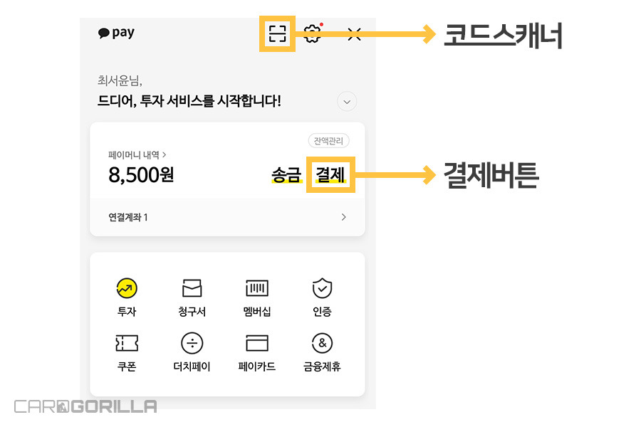 Step 1. 카카오페이 화면의 상단 코드스캐너를 클릭하거나 결제 버튼을 누른다. 코드스캐너는 카카오톡을 흔들어도 나타난다!(쉐이커 기능 설정 필요)
