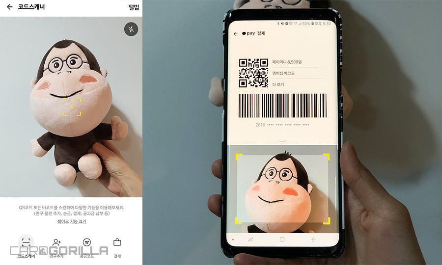 2) 소상공인 매장에서는 내가 직접 매장의 QR코드를 스캔해야 한다. 코드스캐너나 결제버튼을 눌러서 고릴라가 있는 부분에 큐알코드를 스캔하면 된다. 그 다음 금액을 입력하고 보내면 끝. 보통 송금을 하려면 앱을 켜서 계좌번호를 입력해야 하는데 그런 수고로움이 없다.