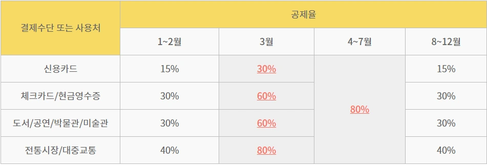 하지만 2021년 연말정산에서는 코로나19로 인해 위기를 맞은 경제 활동을 활성화하기 위해 소득공제율을 한시적으로 확대했다. 3월 사용분은 결제수단에 따라 기존 소득공제율(신용카드 15%, 체크카드 30%)의 2배가 적용되며, 4월부터 7월까지는 신용카드, 체크카드, 현금영수증 모두 연봉의 25%를 초과하는 금액에서 80%의 금액을 공제한다.