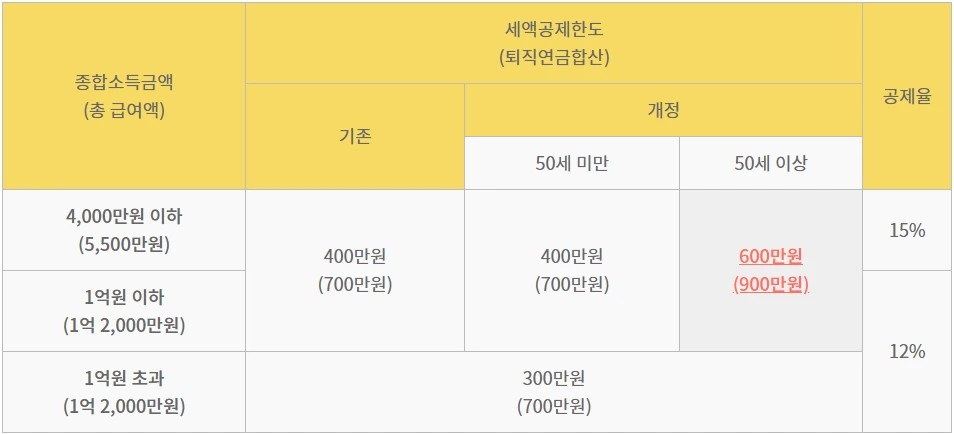 나이가 50세 이상일 경우, 종합소득금액이 1억이하, 총급여 1억2,000만원 이하 근로자는 연금, 퇴직연금 세액공제에서 연금저축계좌 납입 400만원, 퇴직연금계좌 합산 700만원이던 한도가 각각 600만원 900만원으로 상향된다. 20년 1월 1일 이후 납입하는 분부터 적용된다.