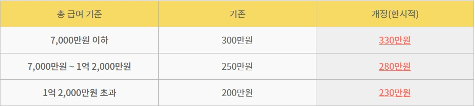 신용카드 소득공제한도액이 한시적으로 구간별 30만원씩 상향되었다. 기존 총급여가 7천만원 이하는 300만원까지, 7천만원 초과하며 1억 2천만원 이하는 250만원까지, 1억2천만원 초과는 200만원까지 소득공제가 가능했지만, 올해는 각각 330만원, 280만원 230만원까지 가능해졌다.