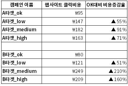 원래 전환비용이 100원이 넘으면 광고를 끄고 다시 세팅하는데, 이번에는 실험을 위해서 가만히 지켜보았습니다. A,B타겟 모두 MEDIUM 보다 HIGH가 비용이 낮았고, 네가지 기준 중에서 OK의 클릭비용이 가장 낮았습니다.