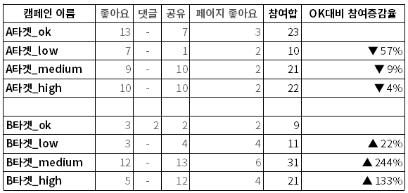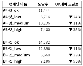 네, 확실히 도달에 차이가 있었습니다. OK가 가장 도달이 잘 되었습니다. B 타겟에서 HIGH는 OK보다 50%나 더 낮은 도달율을 보이기까지 했습니다.
