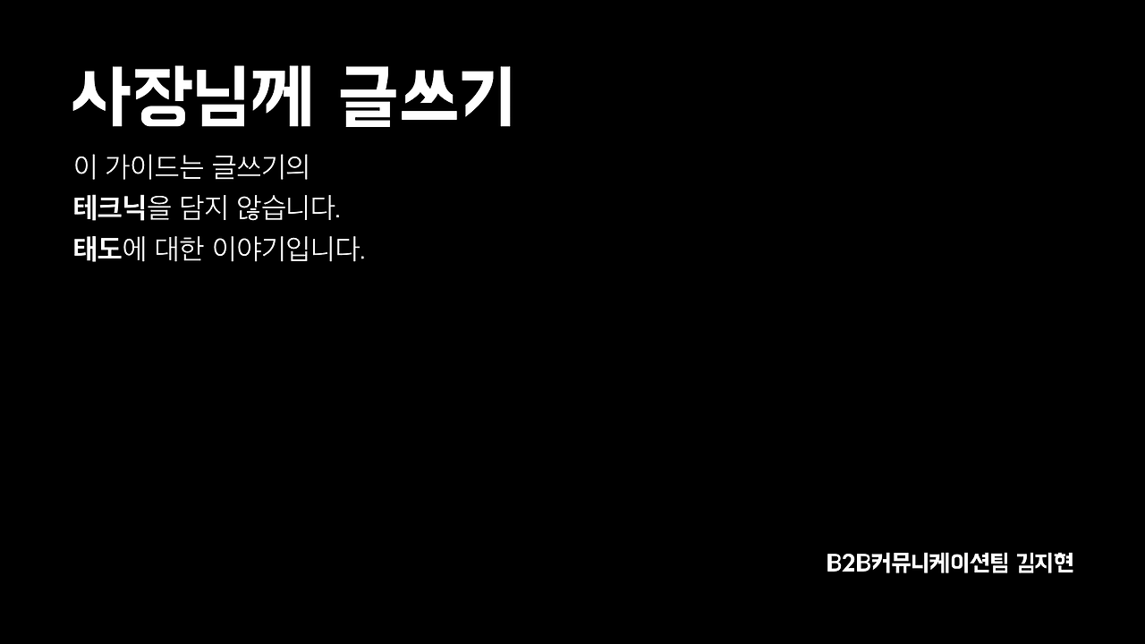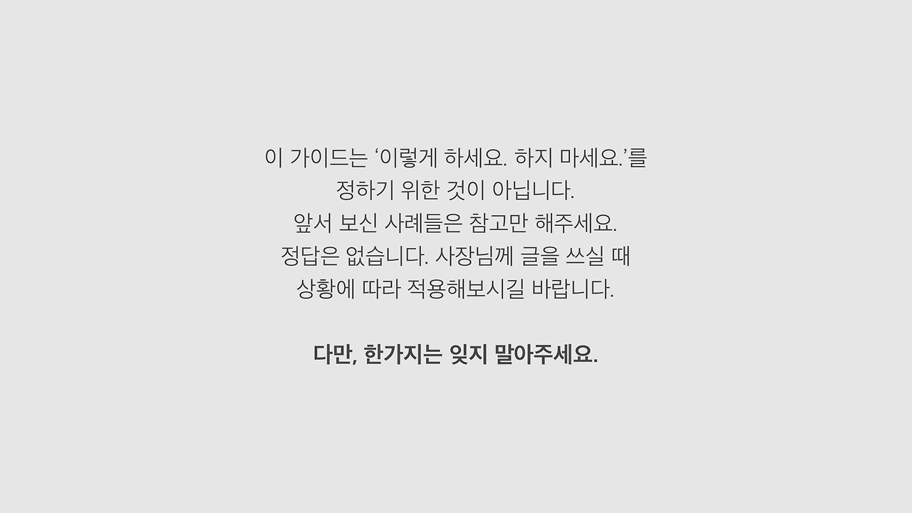 물론 가이드에는 사장님을 생각하는 글의 구체적인 사례들이 담겨 있습니다. 하지만, 결코 그 사례들로 구성원들을 규제하고자 하는 것이 아닙니다. 천편일률적인 진심이 어디 있을까요. 다만, 글을 쓰기 전에 한 번 더 고려해보게 되길 바랬습니다. 사장님을 생각하는 글은 무엇일까. 하고요. 구성원 모두가 한 번씩만 더 고민한다면, 그리고 그 글들이 쌓인다면, 그것으로 이 가이드의 역할은 다한 것입니다.