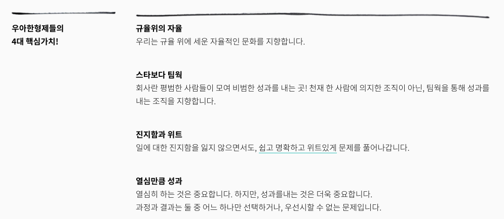 '스타보다 팀웍'. 우아한형제들의 핵심가치 중 하나입니다.