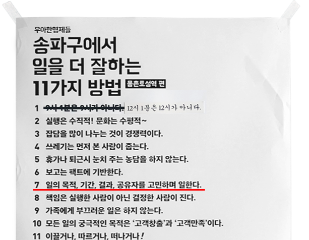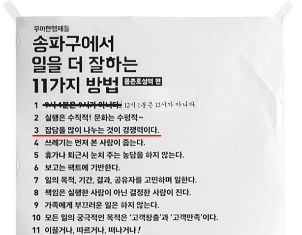 그런데 이제야 어렴풋이 알 것 같습니다. 여기서 '스타'는 유명하지 말라는 것이 아니라, 혼자 외로이 떠있는 별이 되지 말라는 것이었어요. 그렇게 느끼고 나니, '송파구에서 일을 더 잘하는 11가지 방법'도 마음에 와 닿기 시작했습니다.