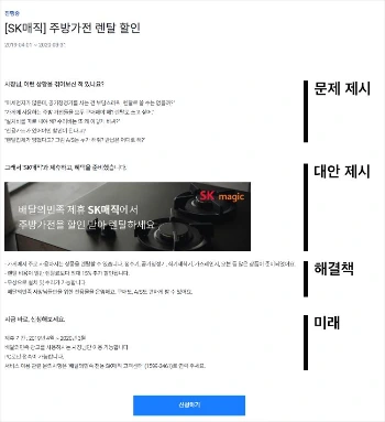 이 해결책 부분에서 가장 신경 쓴 것은 미사여구를 최대한 빼려고 한 것입니다. '최고로, 가장'등의 미사여구는 뺐습니다. 그 자리를 실제 수치로 채워 넣으려 귀찮게했습 노력했습니다. 요즘에는 소비자들이 정보를 접하기 쉽습니다. 우리가 가장 좋다, 우리가 가장 싸다고 한들 소비자들은 그것이 사실인지 아닌지를 금방 알아낼 수 있지요. 그래서 오히려 실제 수치를 알려주는 것이 가장 좋습니다. 물론 그럴 수 있기 위해서는 제휴의 내용이 정말로 좋아야겠지요. 생색내기가 아니고요.