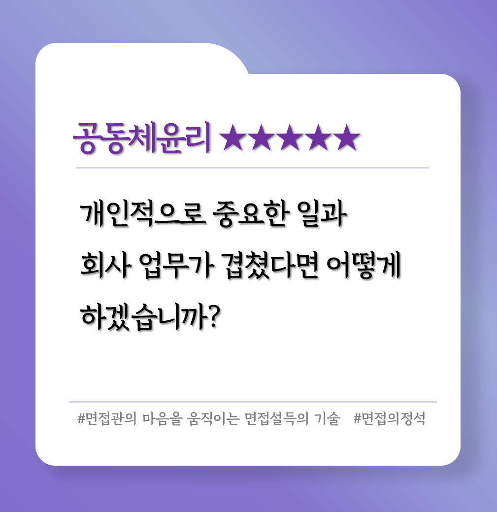 그러므로 공동체 윤리에 해당되는 질문을 받게 된다면 자신만의 가치 기준과 함께 상황에 따른 답변을 하면 좋습니다