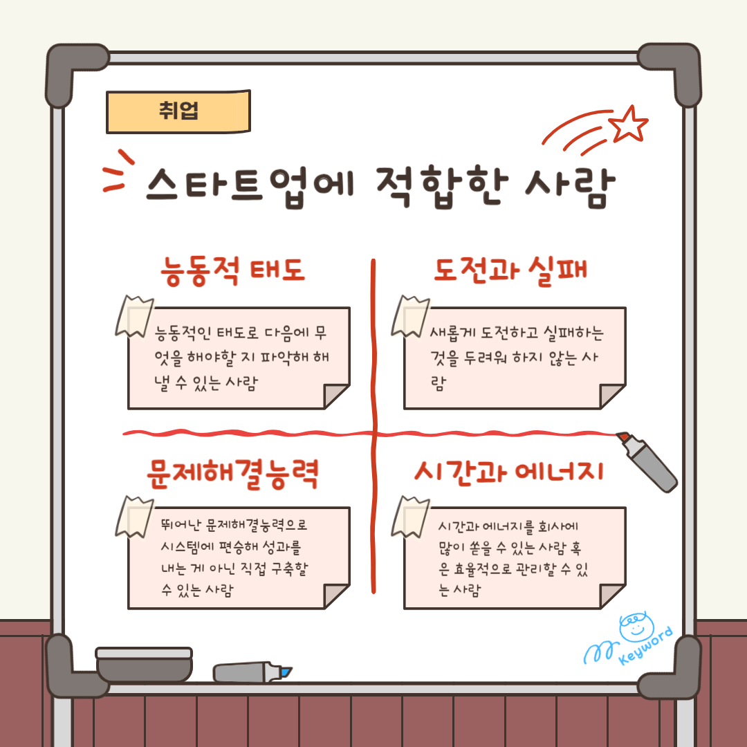 스타트업에 적합한 사람 키워드: 능동적 태도 / 도전과 실패 / 문제해결능력 / 시간과 에너지