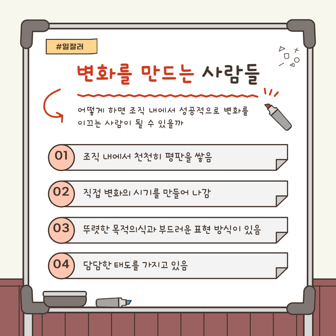 내가 변화를 만드려고 하는 것처럼 다른 사람들도 변화를 만드려고 할 수 있어요. 조직 내 관행이나 비윤리적인 문제를 해결하려고 하는 난이도 있는 변화부터 비효율적인 업무 시스템을 해결하려는 비교적 쉬운 변화가 있을 수 있어요. 만약 그 변화의 필요성에 공감을 한다면 나도 누군가의 변화에 지지자가 되어주세요.