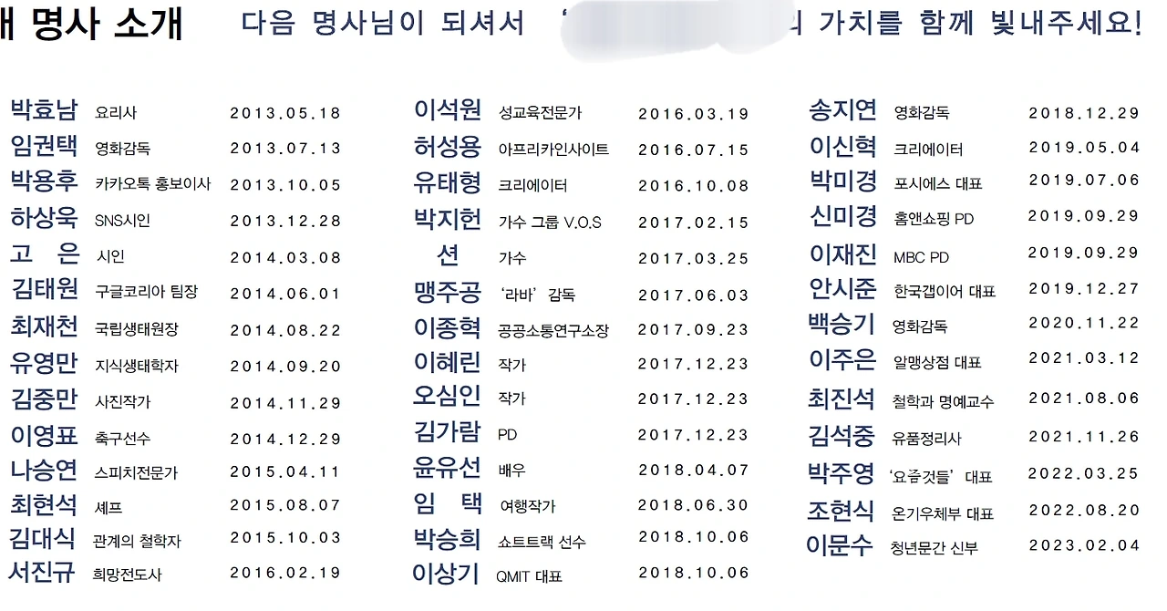임권택 감독, 김중만 사진작가, 이영표 선수, 최현석 셰프, 가수 션, 최진석 교수님까지 대단한분들과 함께 연사 명단에 오를지도 모른다니 참 부담도 되고 신기하기도 하네요