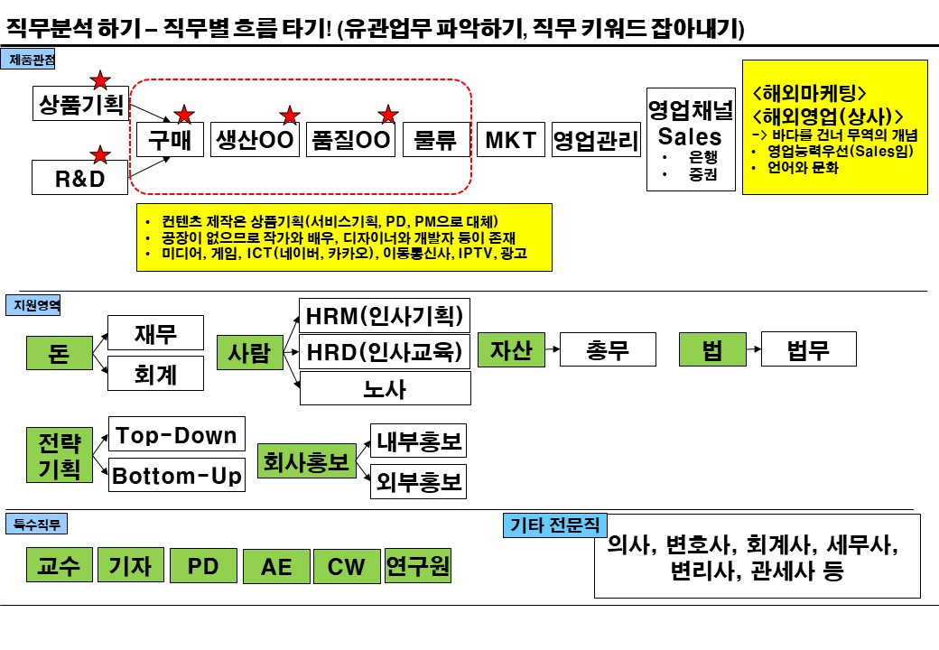 직무분석을 하면서 가장 어려운 것은 이 직무가 정확하게 무엇을 하는 것인지 파악하는 것입니다. 저학년분들은 직무를 보면서 어떤 일을 하는 건지 검색 포털에서 직무명으로 검색을 하고, 현직자 상담, 취업 관련 부서 상담, 특강, 취업포털 속 직무 인터뷰 검색, 브런치 직무 키워드 검색, 기업 홈페이지 속 직무 소개 등을 찾으셔서 어떤 일을 하는지 파악해야 합니다. (* 제가 제일 추천하는 건 현직자의 생생한 직무 소개입니다.)
