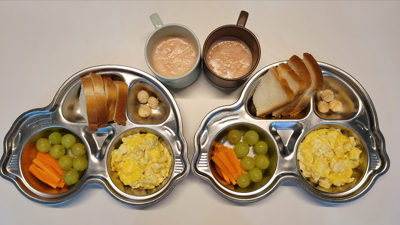오늘은 계란 두 개로 에그 스크램블을 만들어 보았습니다. 우유가 함께 들어가니 부드럽고 맛있었지만 양이 제법 많더군요. 아이들은 맛있다며 잘 먹었지만 조금 남겼습니다. 다음에는 계란 한 개만으로도 충분하겠다는 생각이 들었습니다. 아이들에게 딱 맞는 양을 찾아가는 과정도 즐겁네요. (생당근도 조금 남겼습니다)